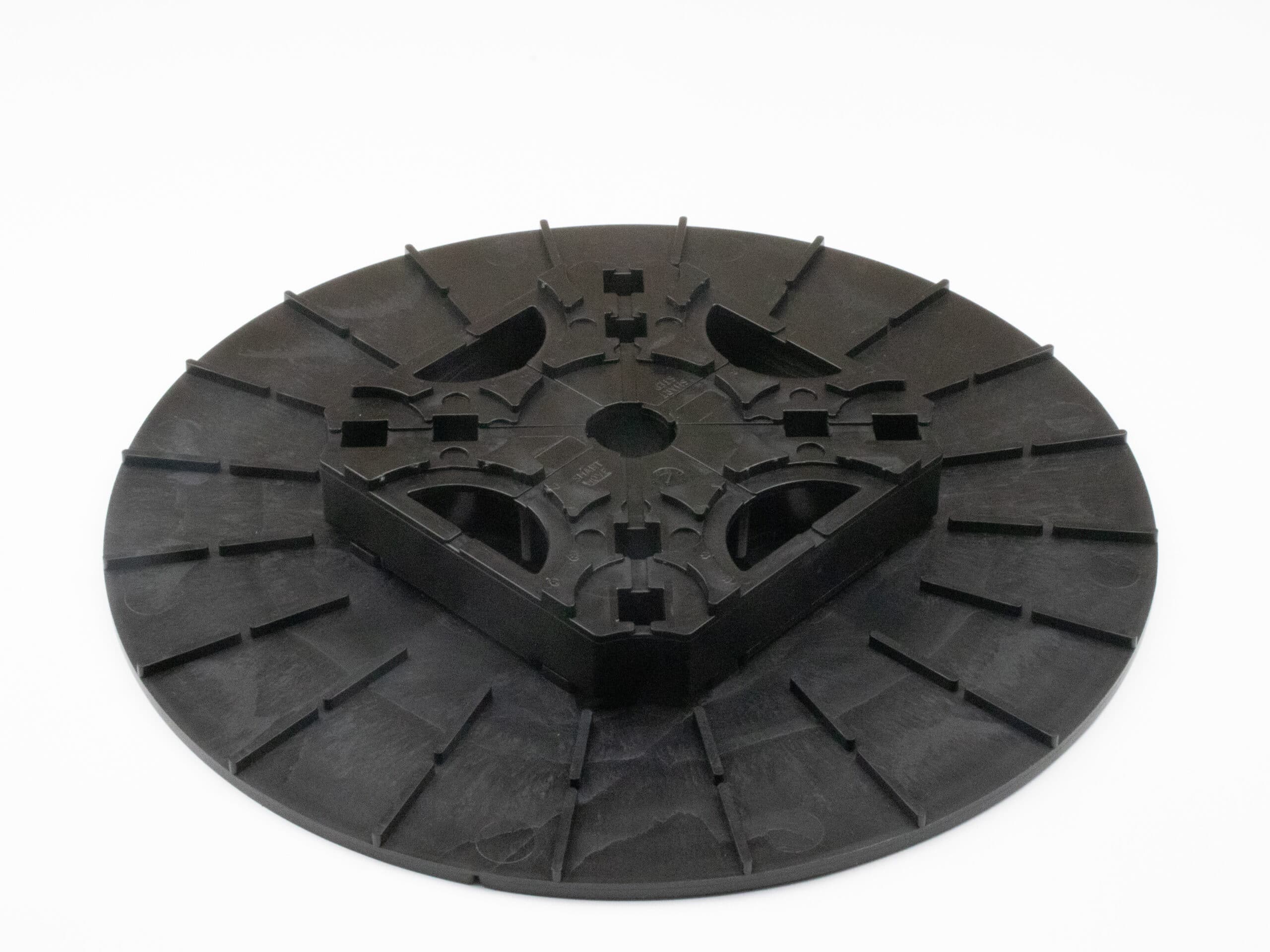 Das Smart Step Stelzlager 7 mm mit Druckausgleichsplatte ist die ideale Grundplatte für weiche Untergründe. Mit einem Durchmesser von 230 mm und Querverstrebungen kann der Druck schwerer Platten besser auf den Untergrund verteilt werden und was ein Einsinken der Stelzlager präventiert. Dank Sollbruchstellen kann das Smart Step Stelzlager 7 mm mit Druckausgleichsplatte problemlos als Eck- und Randlager verwendet werden.